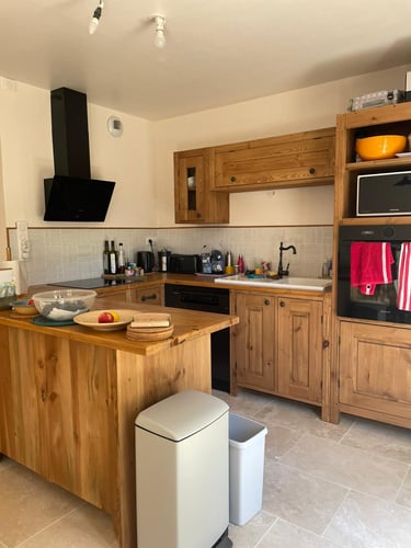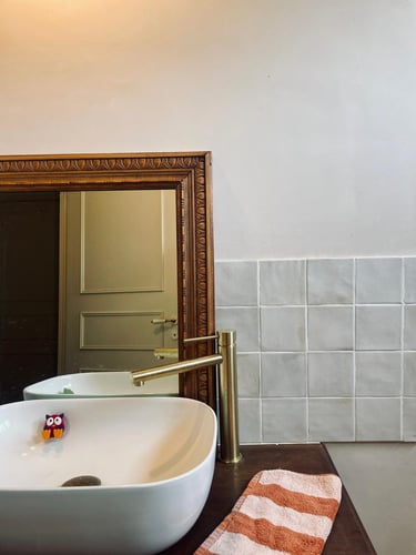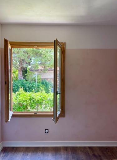 Les matériaux ont été choisi en conséquence des températures du sud de la France. Un travertin au rez-de-chaussée pour avoir une sensation de fraicheur en été, un parquet à l'étage pour pouvoir marcher pieds nues sans avoir froid, même en hiver. Les murs ont été recouverts d'enduits ou badigeons de chaux pour donner un côté intemporel aux espaces tout en utilisant des matériaux naturels.